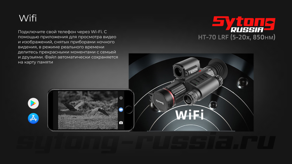 Прицел Sytong обладает функцией подключения к мобильным устройствам через WiFi. Это позволяет в режиме реального времени просматривать видео и изображения на экране вашего смартфона. Специальное приложение, доступное как для Android, так и для iOS, обеспечивает удобный интерфейс для взаимодействия с прицелом. Все файлы автоматически сохраняются на карту памяти прицела, что гарантирует сохранность ваших снимков и видео.