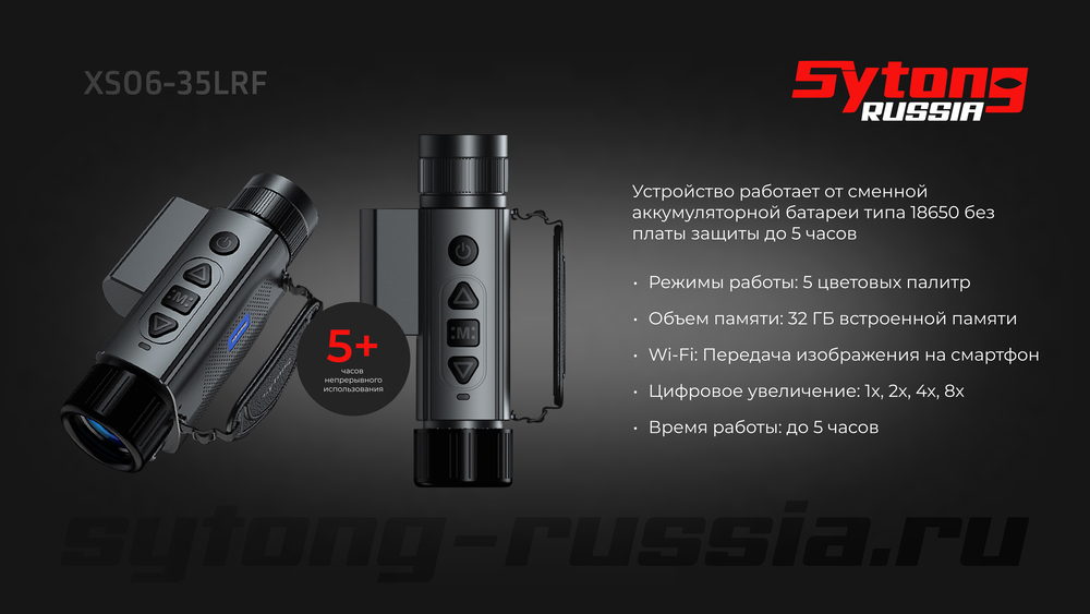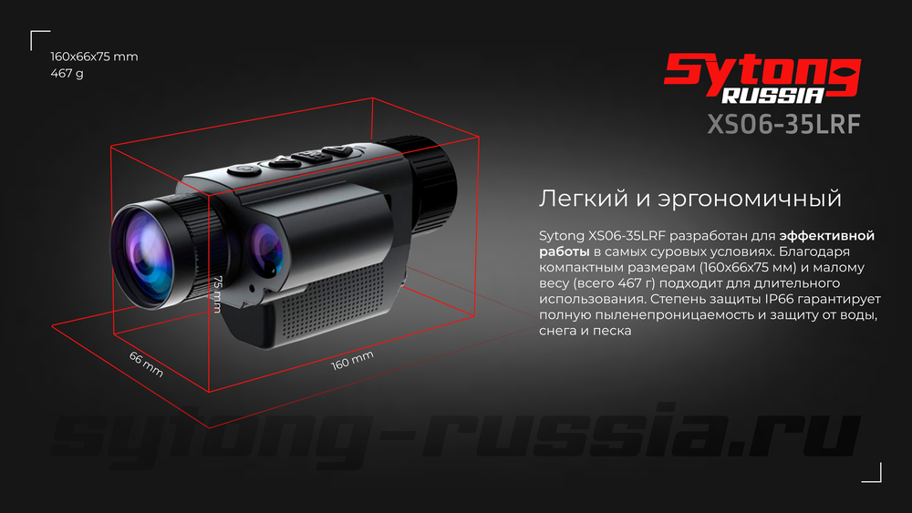 Sytong XS06-25 LRF имеет компактные размеры (160x66x75 мм) и вес всего 467 г, что делает его удобным для длительного использования. Степень защиты IP66 гарантирует полную пыленепроницаемость и защиту от воды.