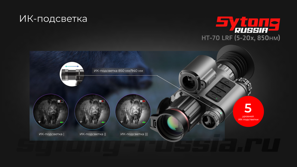 Прицел Sytong HT-70 LRF оснащен "невидимой" ИК-подсветкой 850 нм, которая автоматически активируется в ночном режиме. Подсветка имеет регулируемый фокус и равномерно освещает все поле зрения. В отличие от аналогов, здесь доступно пять уровней мощности вместо трех. При максимальной мощности и 5-кратном увеличении прицел различает мелкие детали на расстоянии 50 метров, четко видит зайца на 250 метрах и крупные объекты на 300-400 метрах. Это делает прицел эффективным для ночной охоты и наблюдений.