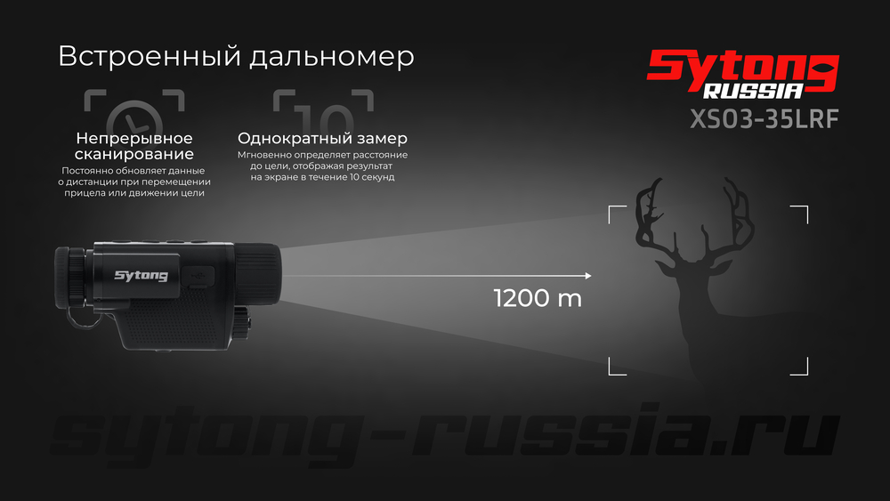 Sytong XS03-35 LRF оснащен встроенным лазерным дальномером, способным точно измерять расстояния до 1200 метров. Дальномер предлагает два режима работы: однократный замер и непрерывное сканирование.